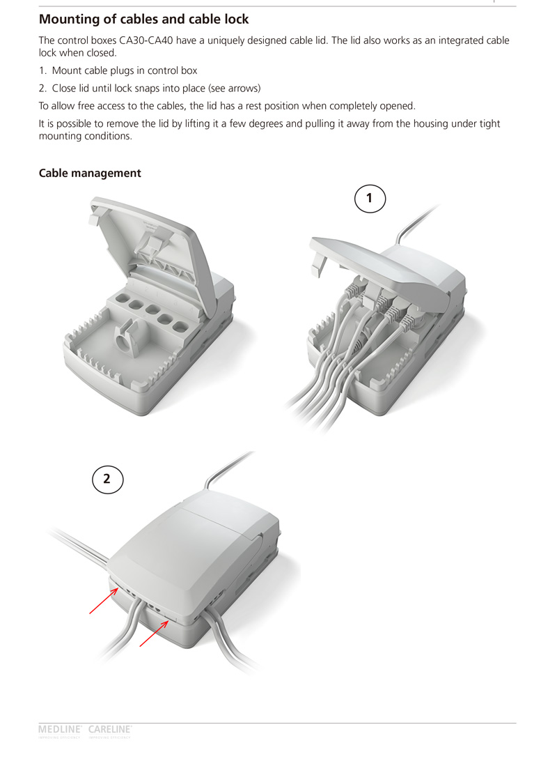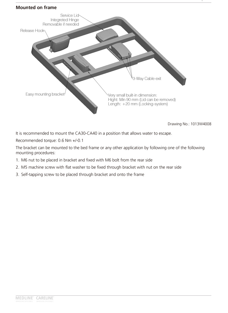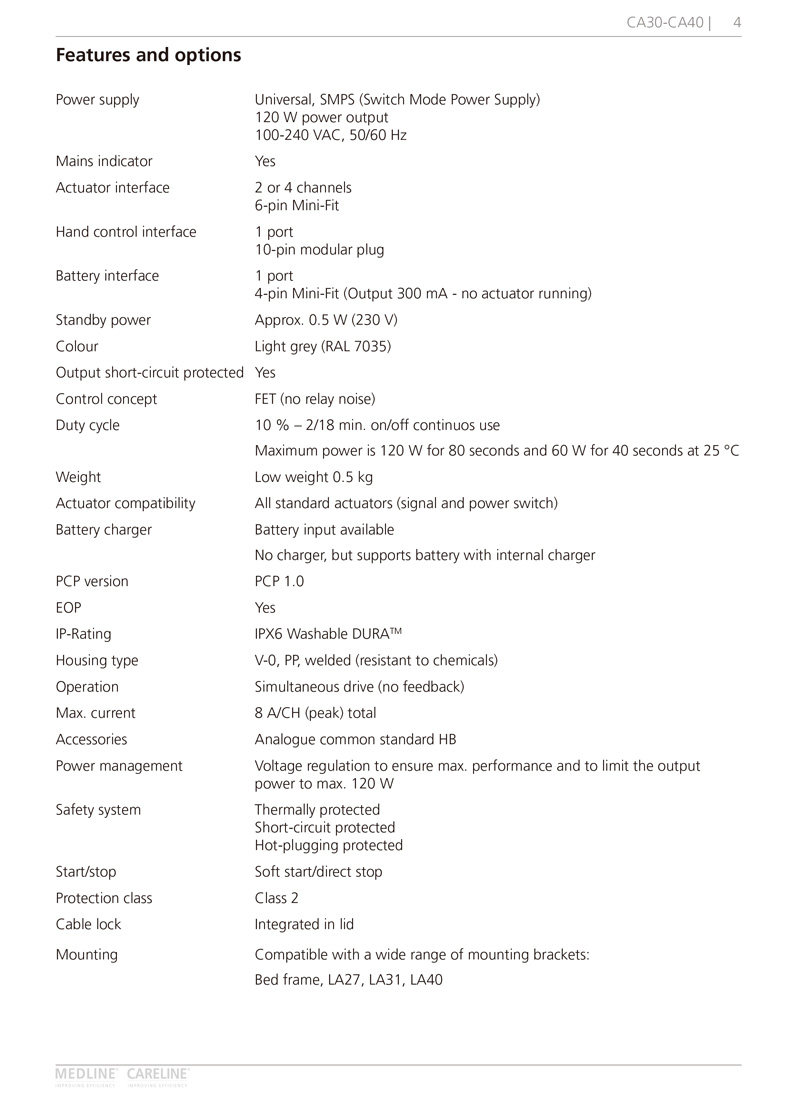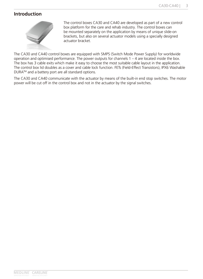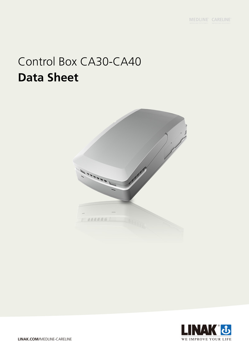 The control boxes CA30 and CA40 are developed as part of a new control box platform for the care and rehab industry. The control boxes can be mounted separately on the application by means of unique slide-on brackets, but also on several actuator models using a specially designed actuator bracket.
