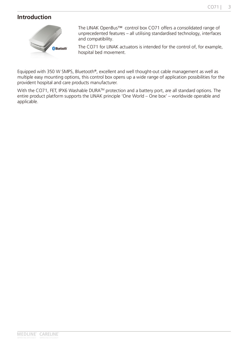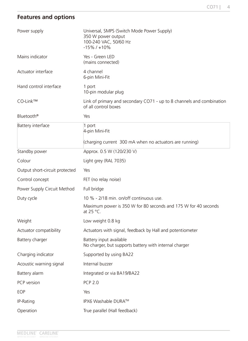 With the CO71, FET, IPX6 Washable DURA™ protection and a battery port, are all standard options. The entire product platform supports the LINAK principle "One World – One box" – worldwide operable and applicable.